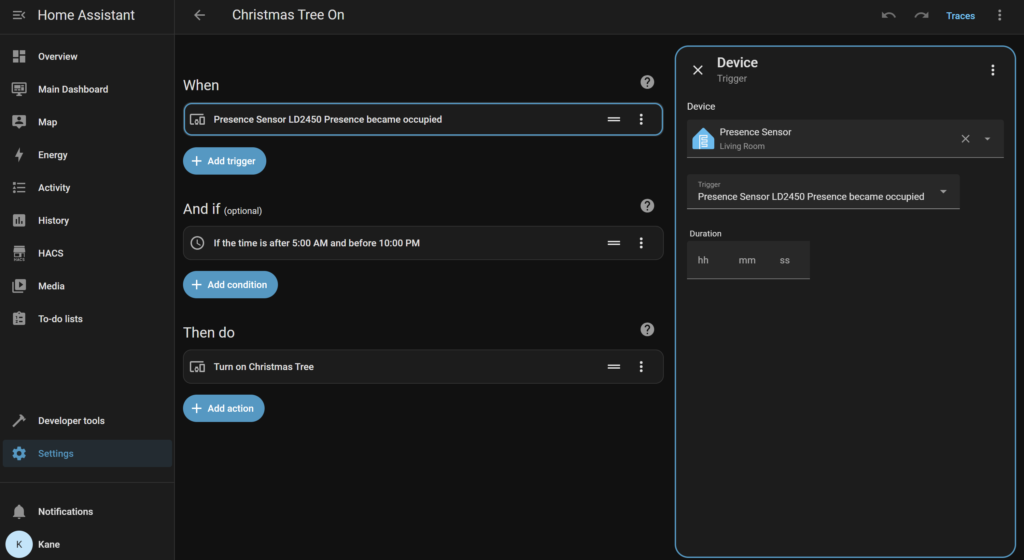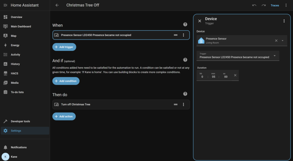 - Once the mmWave radar presence detection reports “not occupied” for five minutes, Home Assistant turns the tree off for you.