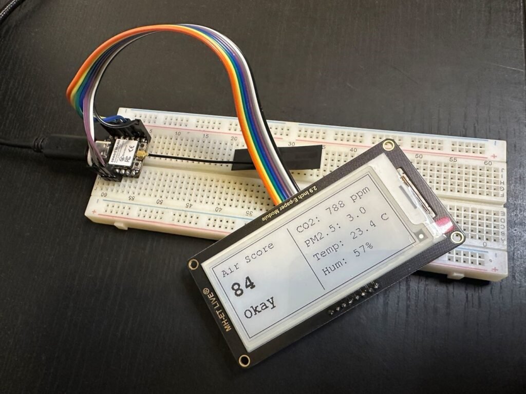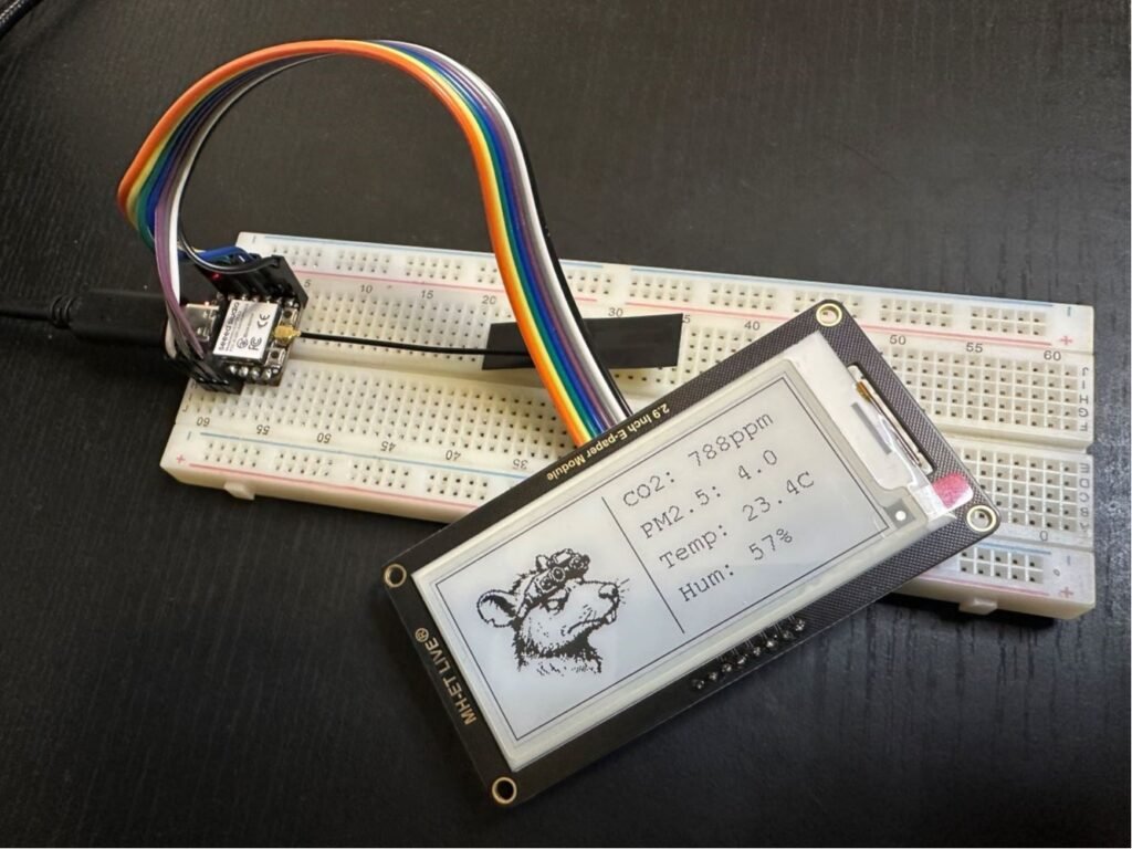 In this tutorial, I’m using an ESP32-C3 with a small SPI e-paper display. I’ll start with a simple text test, then move on to displaying MQTT data from my air quality sensor, and finally add a small logo using bitmap data.